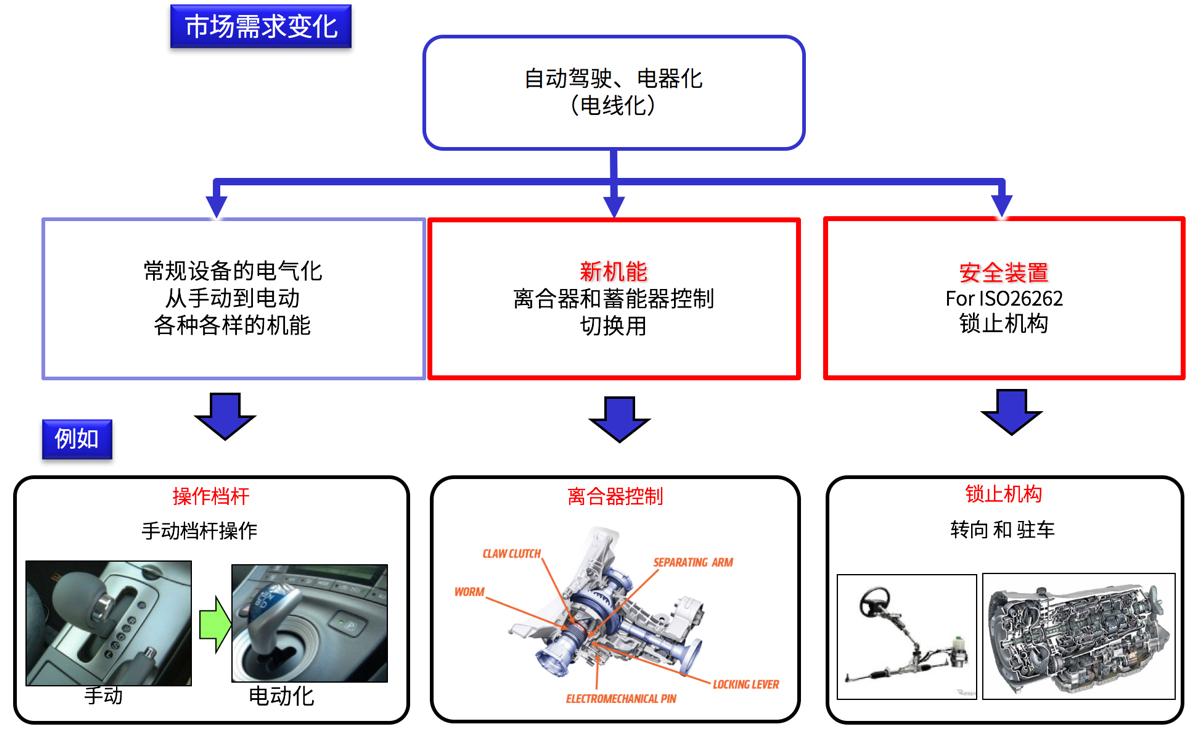 對應(yīng)汽車的電動(dòng)化課題,通過電磁執(zhí)行器來實(shí)現(xiàn)由手動(dòng)到電動(dòng)的變化, 如自動(dòng)駐車、電子換擋、離合器控制等